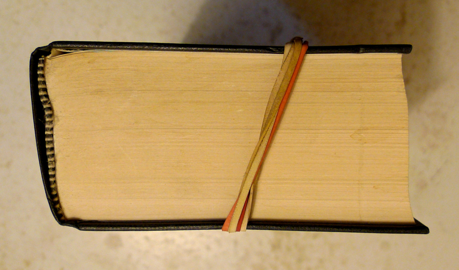 iii: Close the book and skew it back, slightly beyond straight, to an opposite skew: secure it in this position with an elastic band vertically round the boards, angled, where it crosses at top and bottom, so as to maintain the pull.