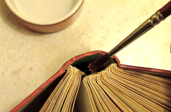 ii: Damp the spine of the text block: I use a soft brush poked carefully half way down the hole from the top: then invert the book and repeat.